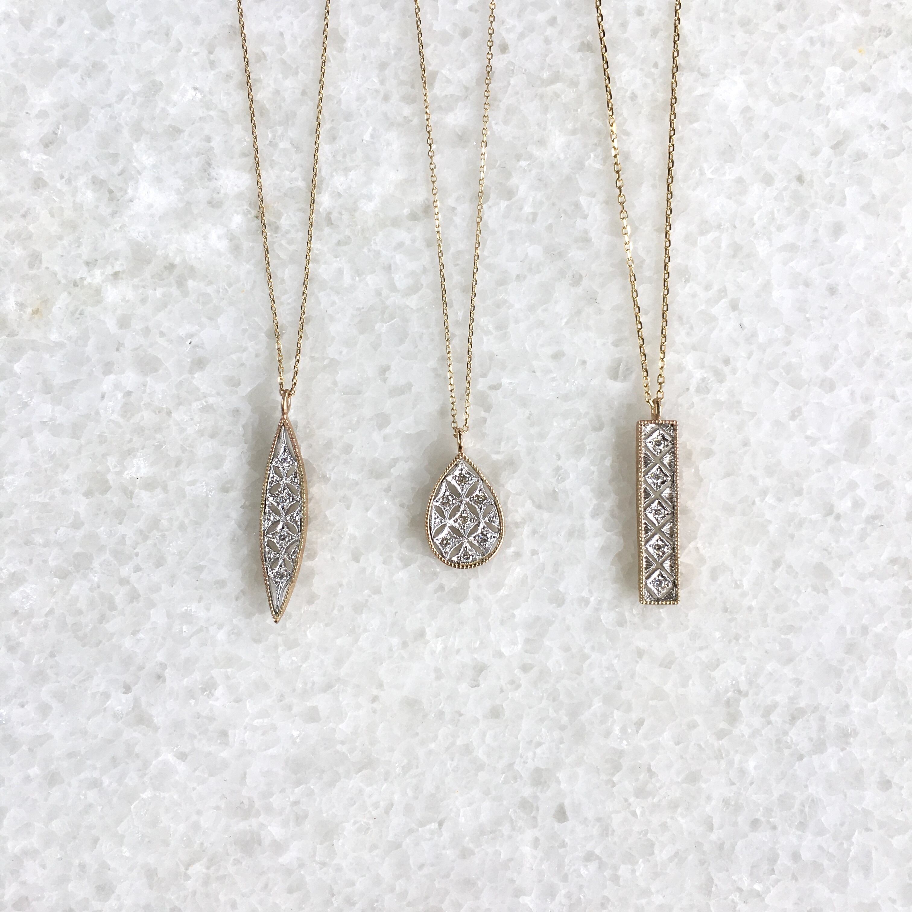 透かしで飾った格子模様が収まる、軽やかなネックレスです。
