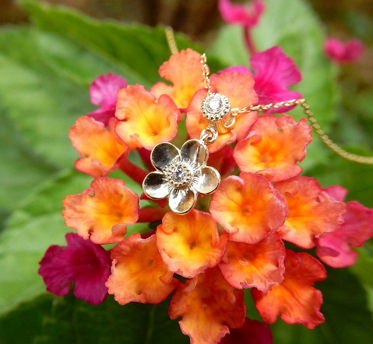 花の中心とチェーンを通すパーツにもダイヤモンドをあしらい、