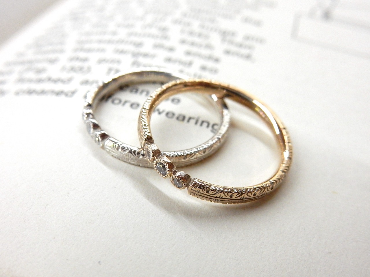 飾り彫りを施されたリングの中心に、大きさを変えたダイヤモンドを3石留めました。
