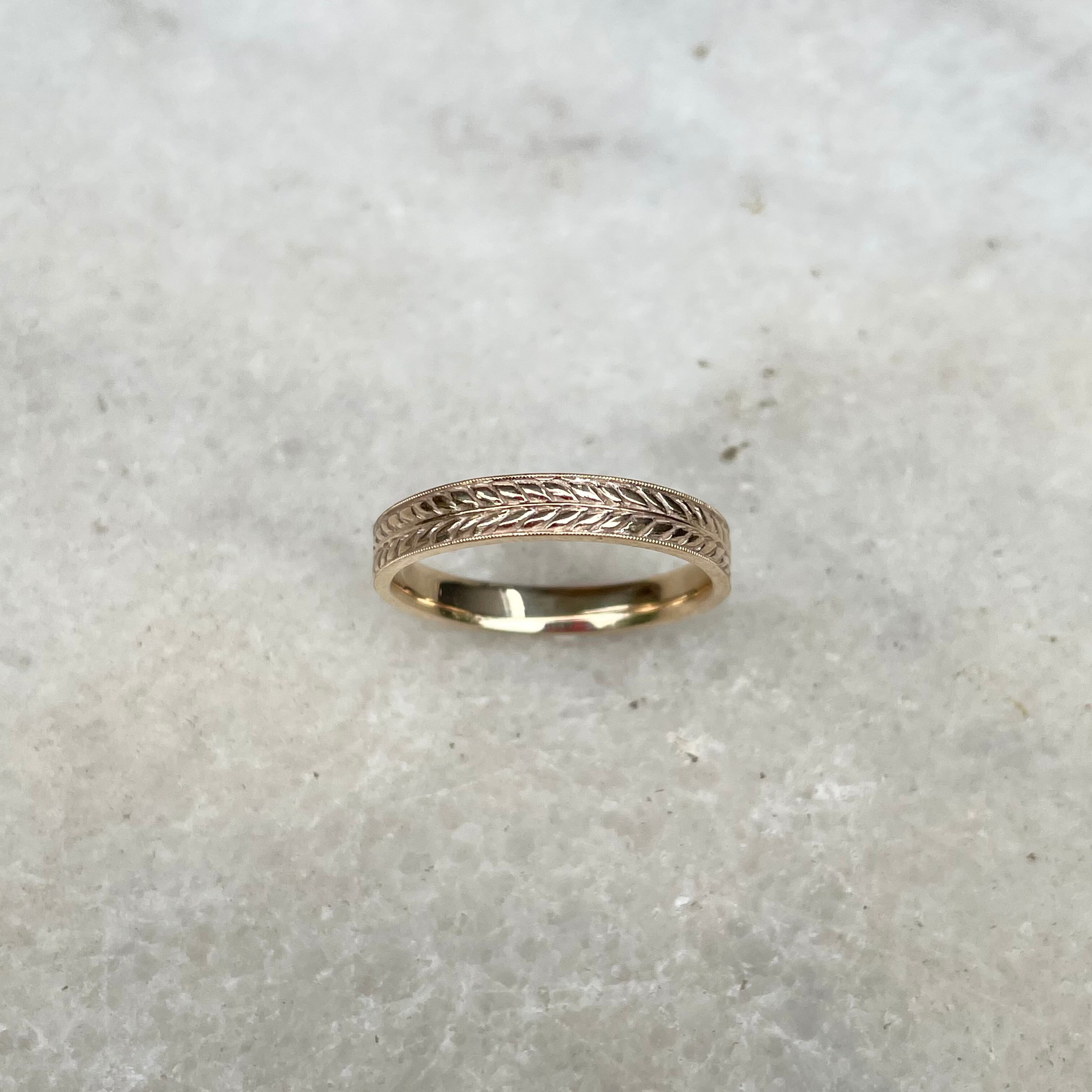 タガネで一枚一枚彫り起された月桂樹のリングです。